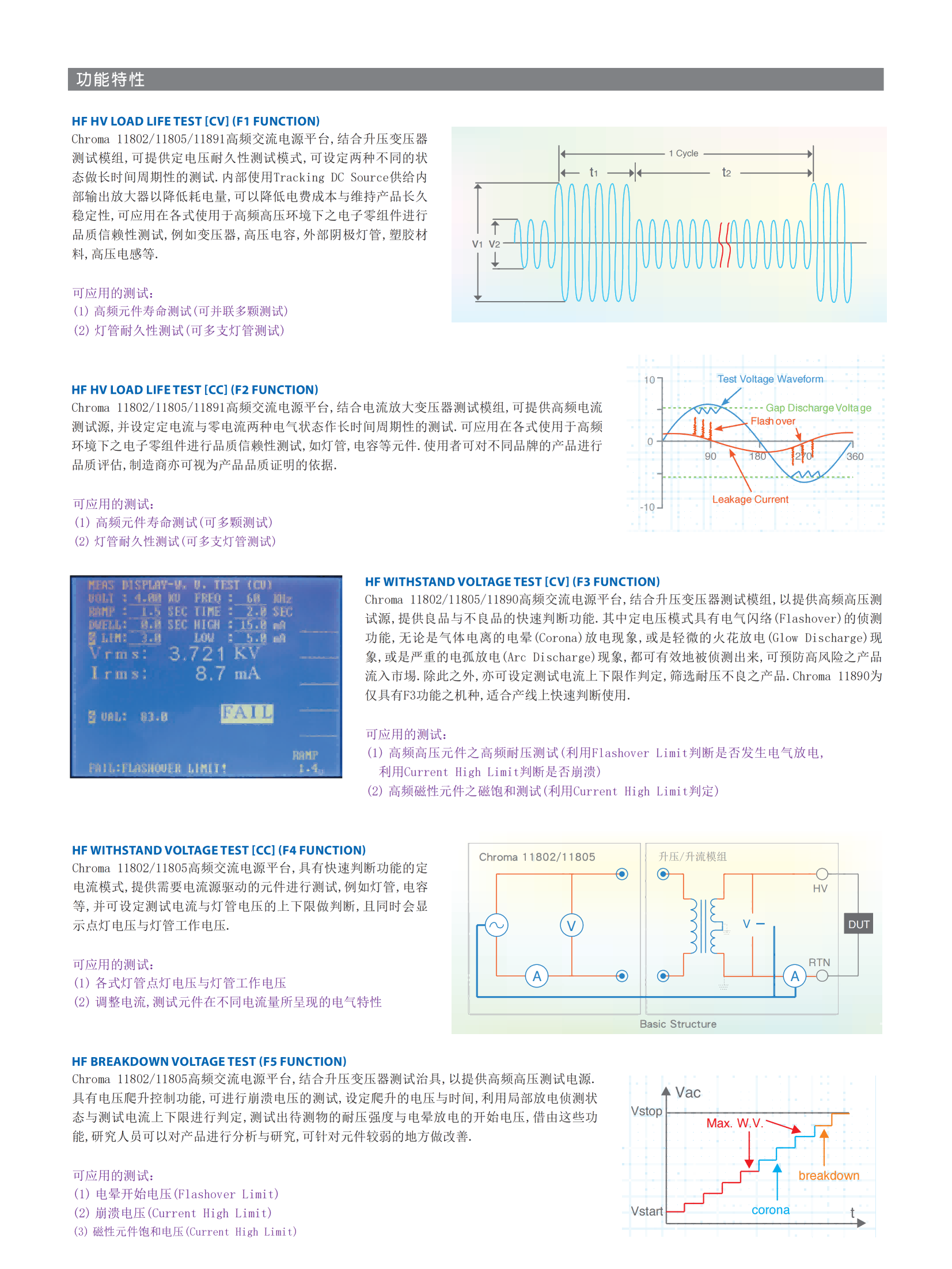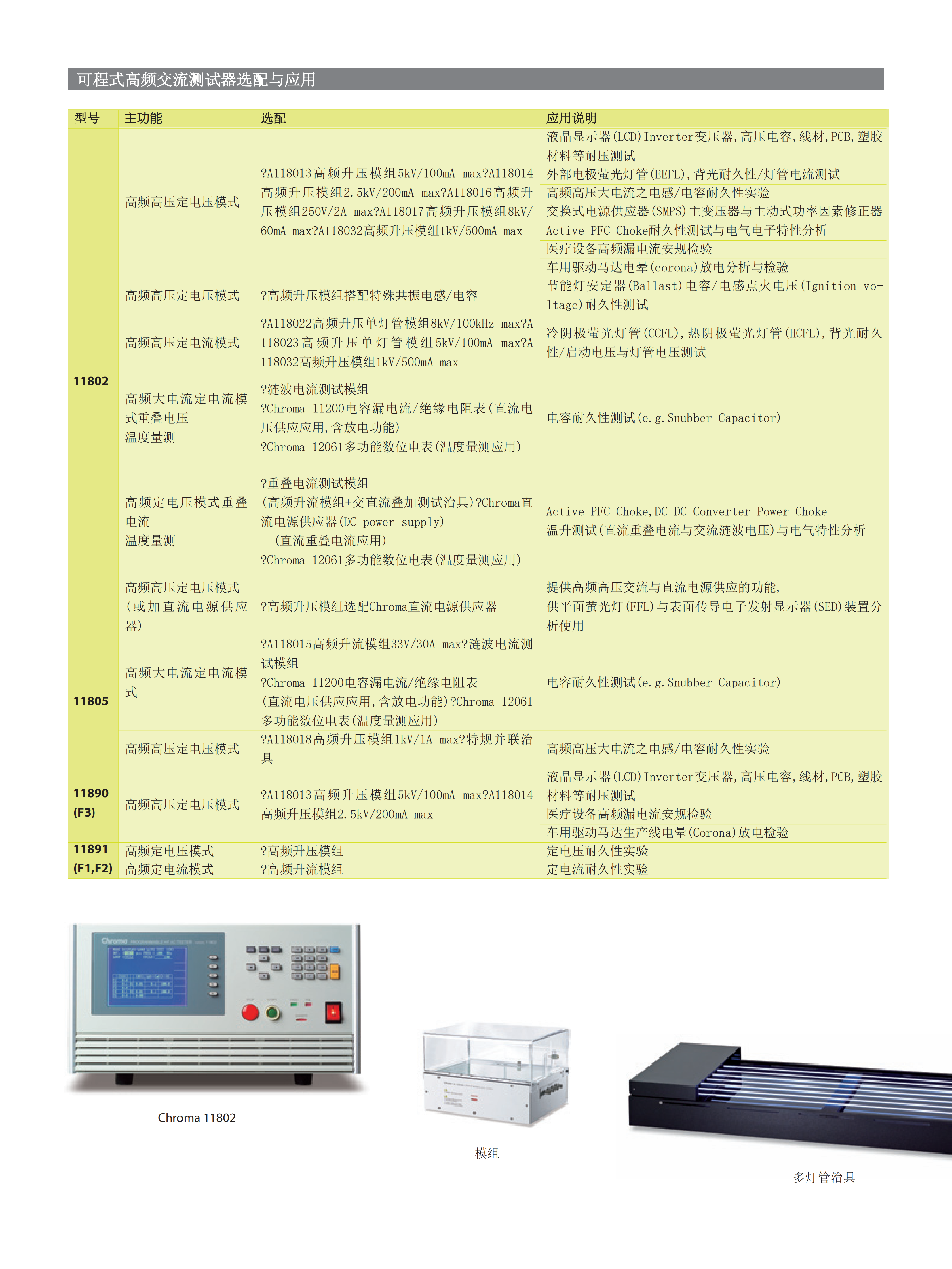Chroma 11802系列可程式高频交流测试器是数位控制的高频交流电源平台,结合不同的模组,可提供高频高压或高频大电流的测试方式。