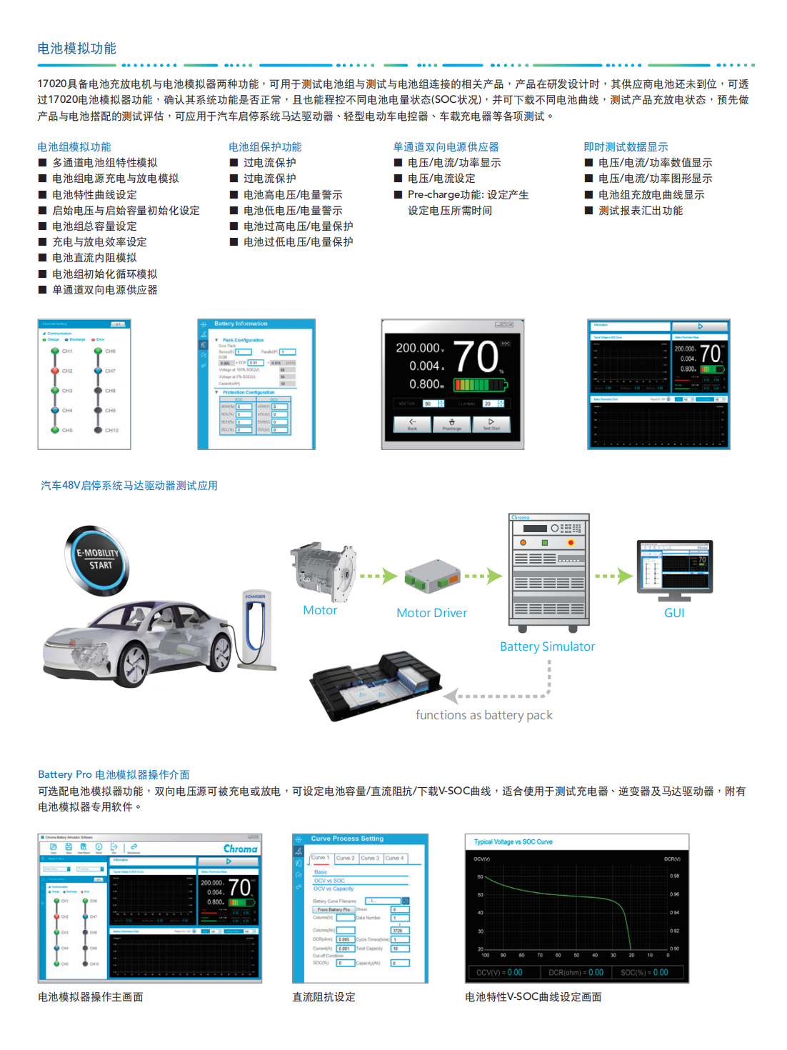 Chroma 17020系统是专门为二次电池组测试而开发的高精密设备,适合用于电池组续航力试验、产品进出货检验、设计验证研究、电池组生产线上容量学习(Learning)与测试等用途。