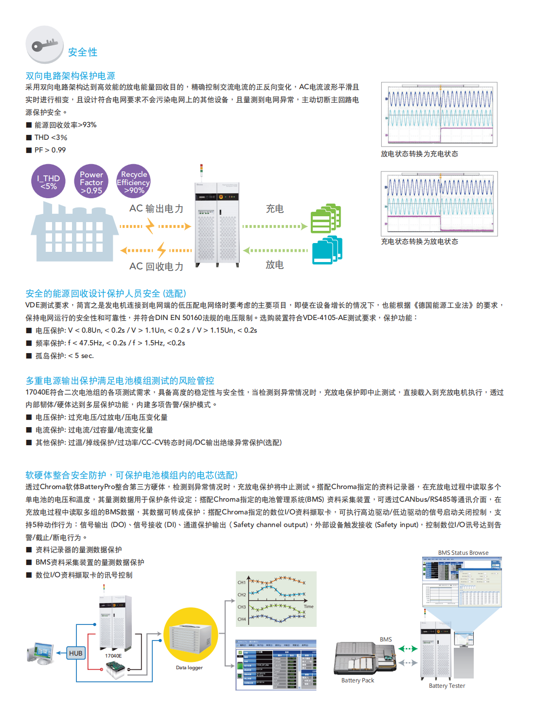 Chroma 17040E电池模组测试系统是专为高功率二次电池组测试而开发的高精密充放电设备,具有能源回收功能,可节省放电过程所消耗的大量电能,即使动态充放电,也能确保电网端维持稳定,不致因谐波污染影响其他设备。