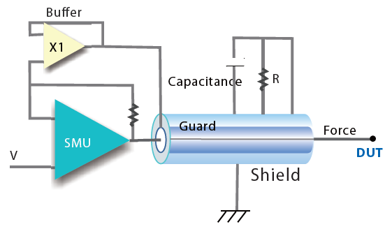 护卫输出(Guarding)的应用在低电流(< 奈安)量测时是一项很重要的技术。护卫输出可以避免漏电流的问题,并降低量测稳定时间,此输出可保持与主输出(Force)为同电位,如此在护卫输出与主输出间不会有电流产生。护卫输出同时也消除了电源量测单元与待测体之间导线的电容,使得量测变得快速且精准。