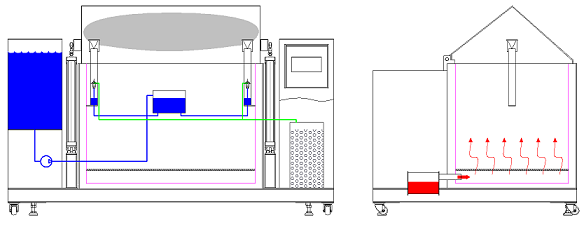 l喷嘴将腐蚀溶液雾化成腐蚀性汽雾,腐蚀性汽雾通过扩散塔后均匀分布在测试箱内