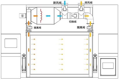 切换阀打开,隔离阀打开,新风阀关闭,排风阀关闭,测试箱处于内循环模式